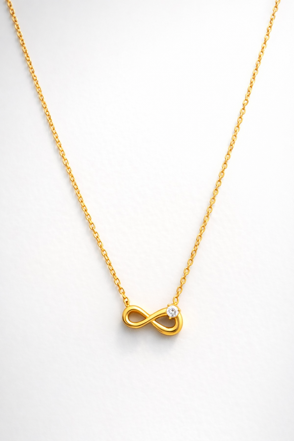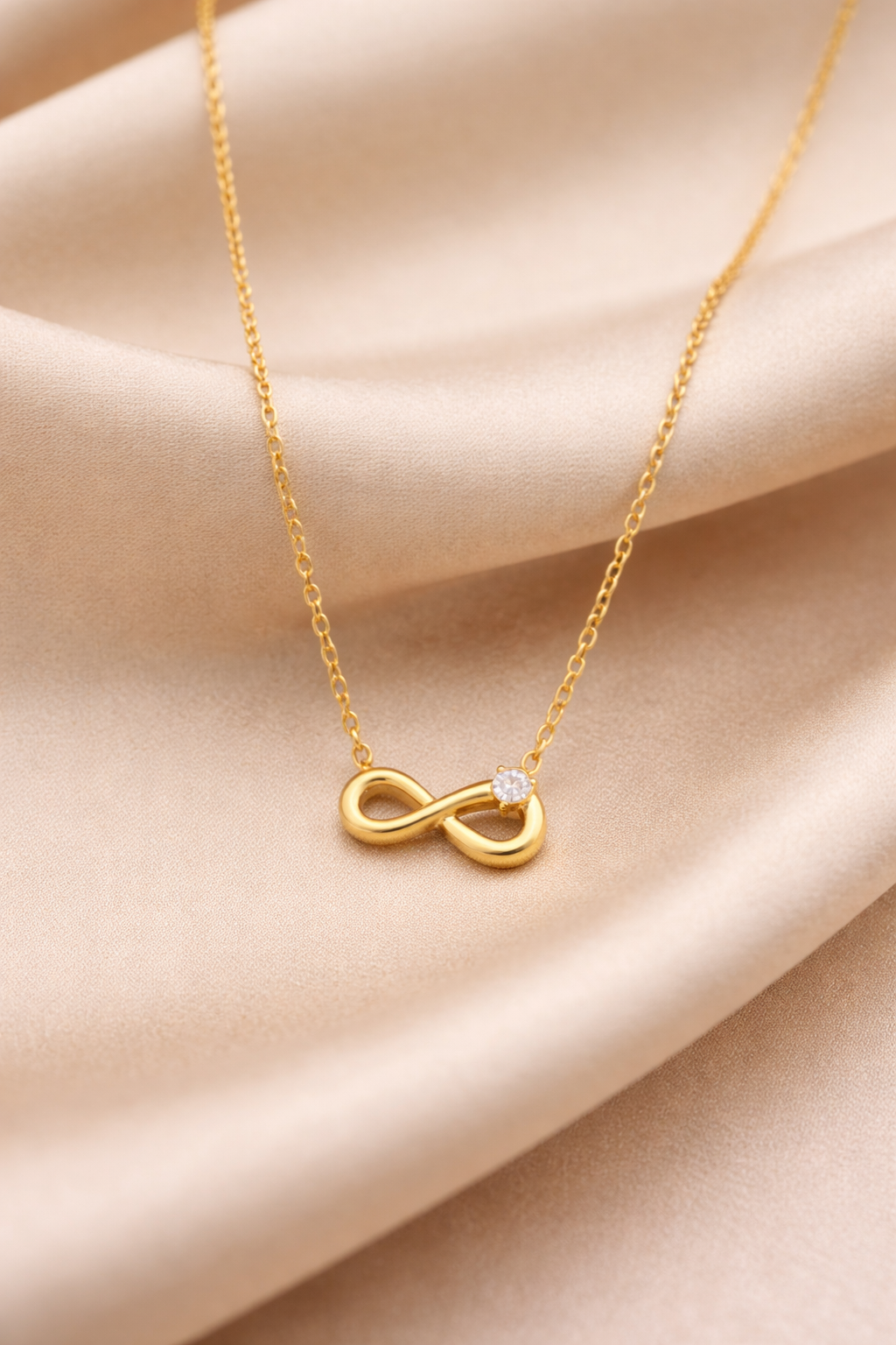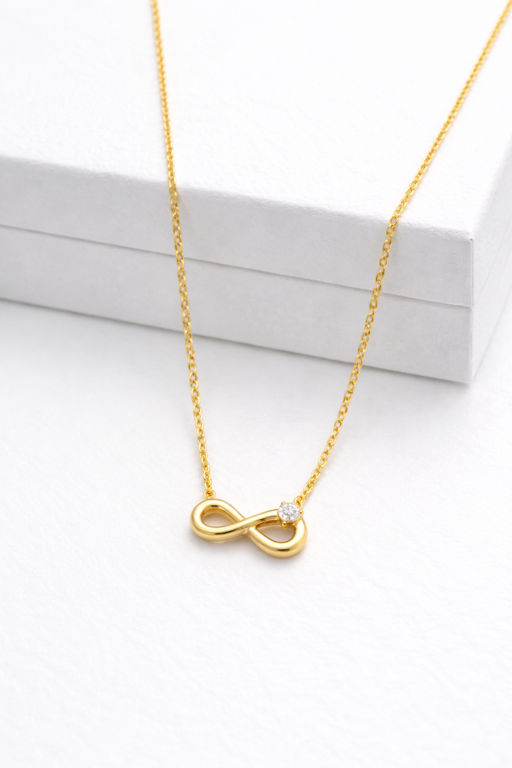 Elegant and timeless, this infinity pendant necklace features a sleek gold design accented with a delicate sparkling stone. Crafted with a fine chain and polished finish, it symbolizes everlasting style and sophistication—perfect for everyday wear or gifting.